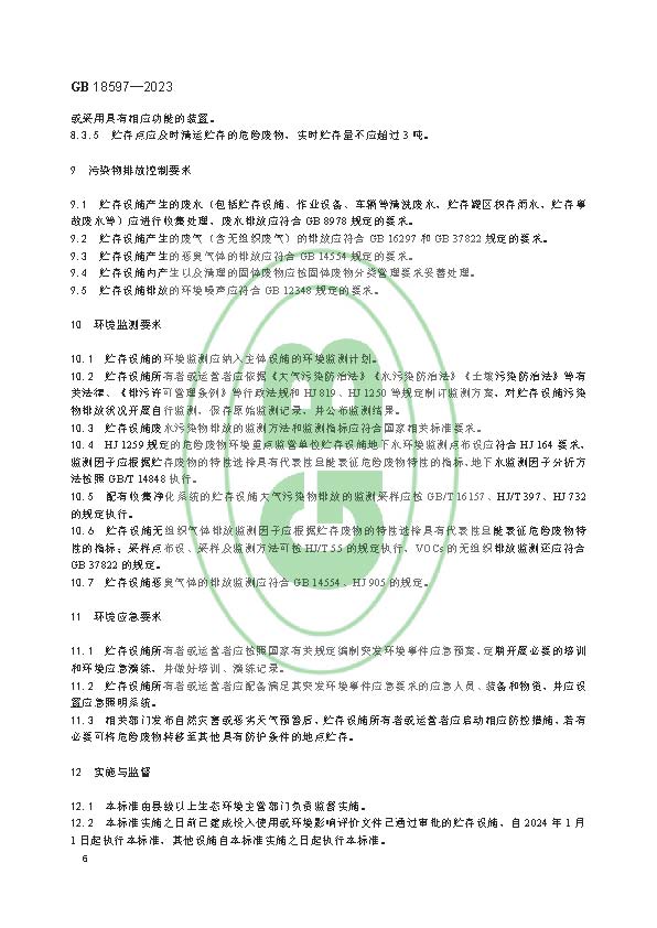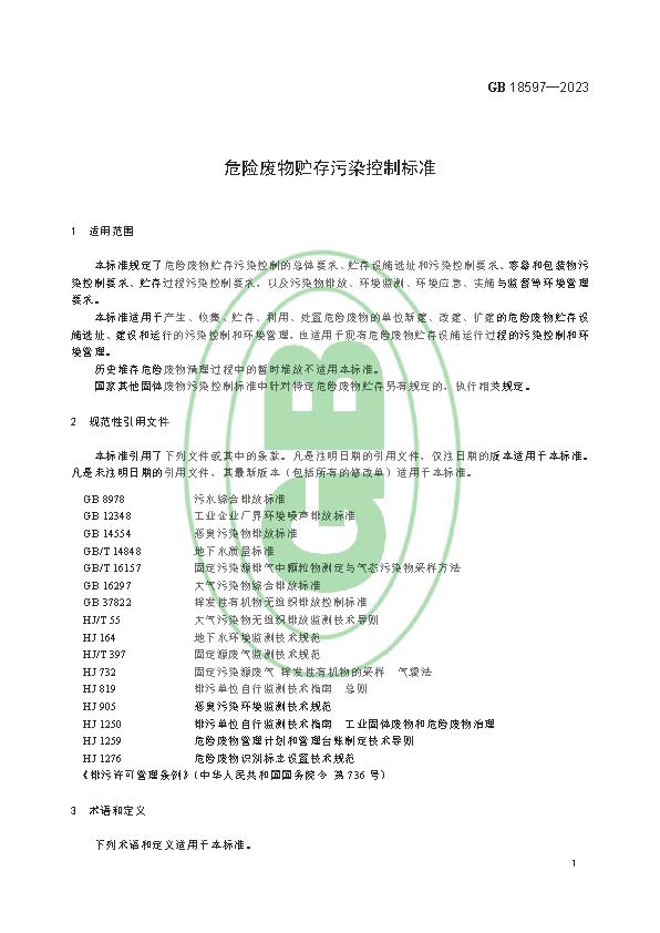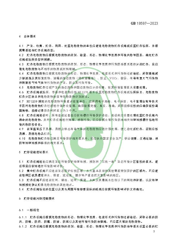 為貫徹《中華人民共和國(guó)環(huán)境保護(hù)法》《中華人民共和國(guó)固體廢物污染環(huán)境防治法》等法律法規(guī),防治環(huán)境污染,改善生態(tài)環(huán)境質(zhì)量,規(guī)范危險(xiǎn)廢物貯存環(huán)境管理,制定本標(biāo)準(zhǔn)。本標(biāo)準(zhǔn)規(guī)定了危險(xiǎn)廢物貯存污染控制的總體要求、貯存設(shè)施選址和污染控制要求、容器和包裝物污染控制要求、貯存過(guò)程污染控制要求,以及污染物排放、環(huán)境監(jiān)測(cè)、環(huán)境應(yīng)急、實(shí)施與監(jiān)督等環(huán)境管理 要求。本標(biāo)準(zhǔn)首次發(fā)布于2001 年,本次為第一次修訂。本標(biāo)準(zhǔn)由生態(tài)環(huán)境部固體廢物與化學(xué)品司、法規(guī)與標(biāo)準(zhǔn)司組織制訂。本標(biāo)準(zhǔn)由生態(tài)環(huán)境部2023 年1 月20 日批準(zhǔn)。本標(biāo)準(zhǔn)自2023 年7 月1 日起實(shí)施。自本標(biāo)準(zhǔn)實(shí)施之日起,《危險(xiǎn)廢物貯存污染控制標(biāo)準(zhǔn)》(GB 18597—2001)廢止。