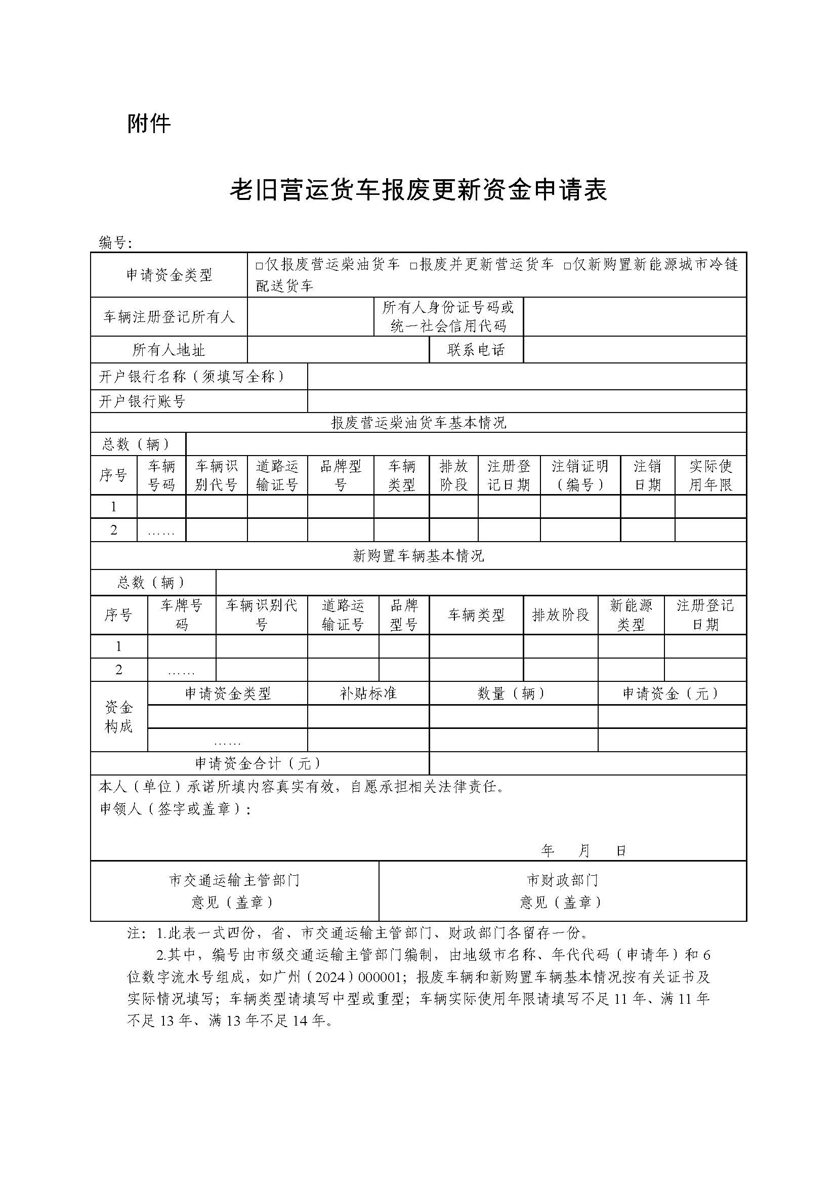 申請交通運輸老舊營運貨車報廢更新補貼資金的營運貨車所有人應當在政策實施期內(nèi)向其所在地設區(qū)的市級交通運輸主管部門提出申請,填報《老舊營運貨車報廢更新補貼資金申請表》(附件),并提交以下證明材料復印件或掃描件: