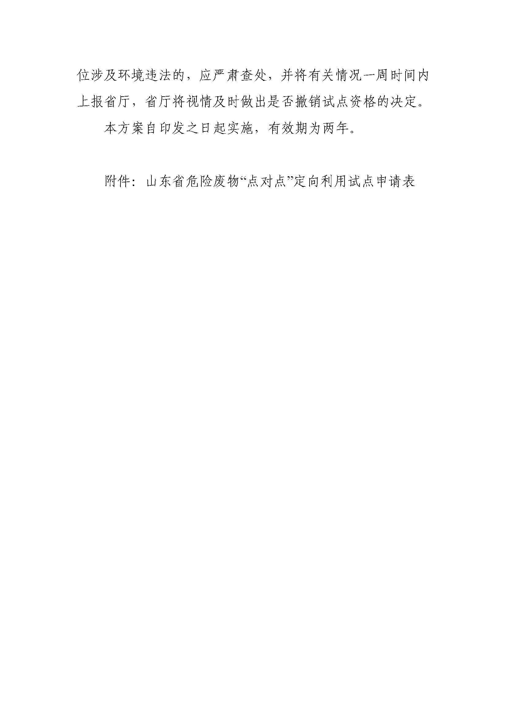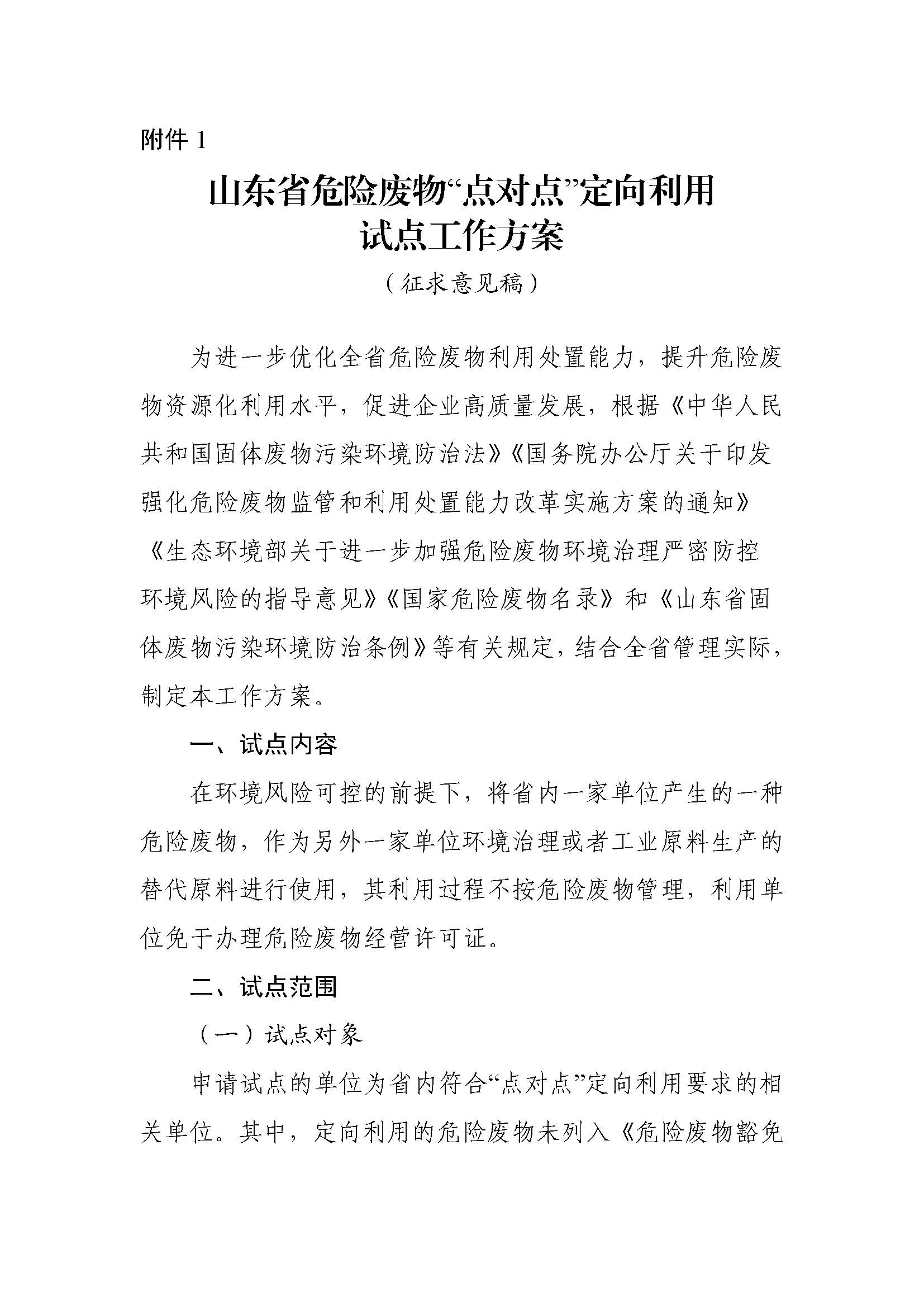 附件:1.山東省危險廢物“點(diǎn)對點(diǎn)”定向利用試點(diǎn)工作方案(征求意見稿)