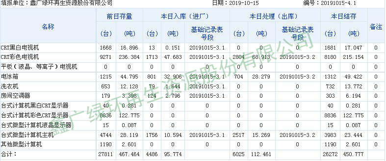 2019.10.15回收拆解統(tǒng)計表