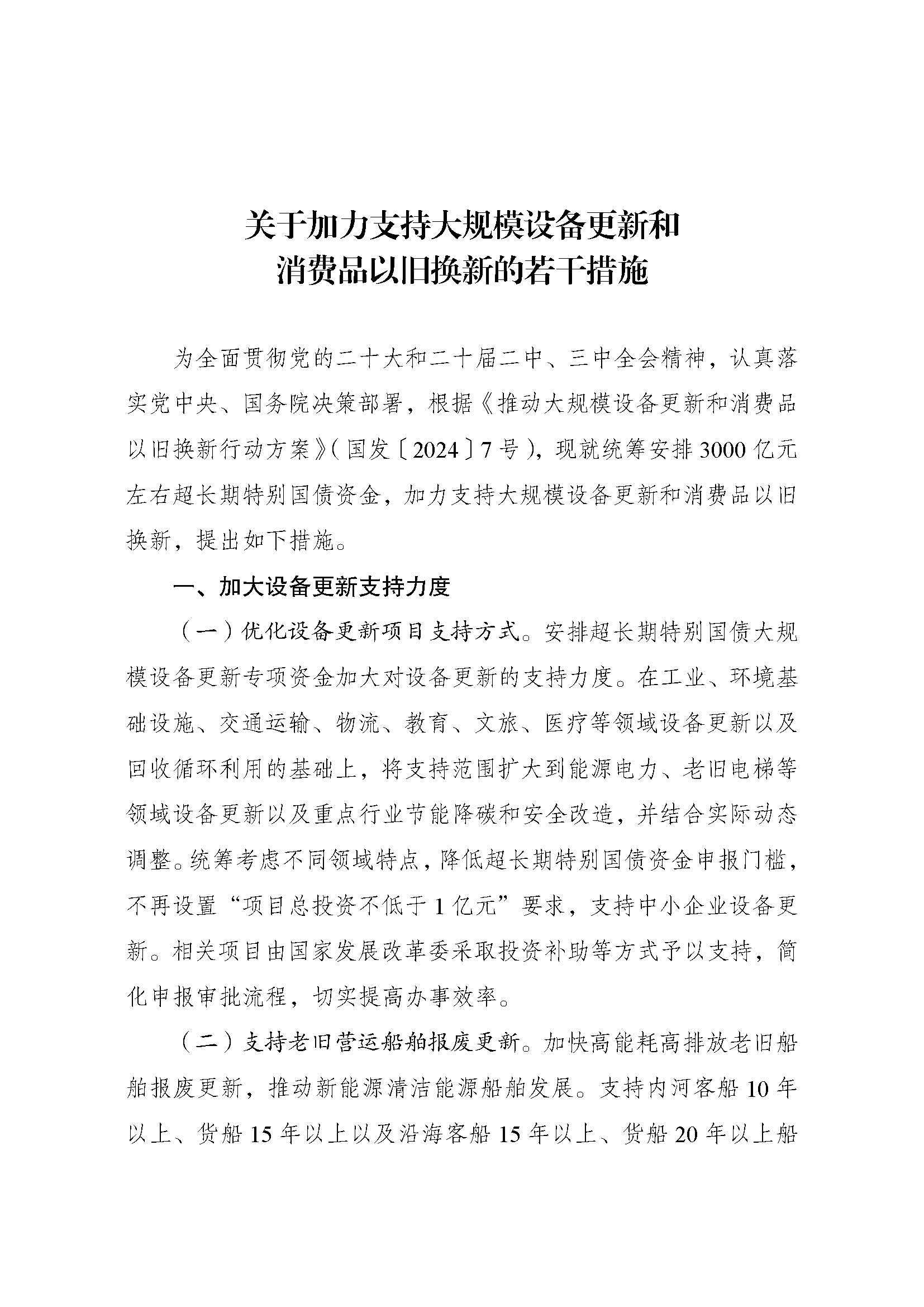 《關(guān)于加力支持大規(guī)模設(shè)備更新和消費(fèi)品以舊換新的若干措施》已經(jīng)國(guó)務(wù)院同意?,F(xiàn)印發(fā)給你們,請(qǐng)認(rèn)真貫徹落實(shí)。