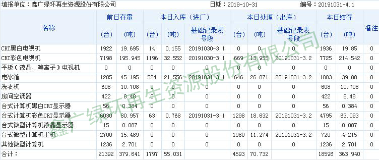 2019.10.31回收拆解統(tǒng)計表